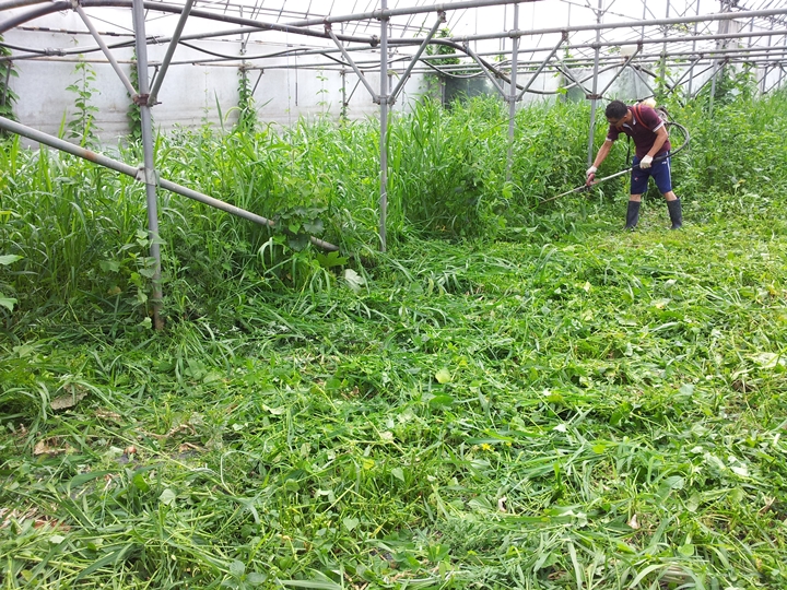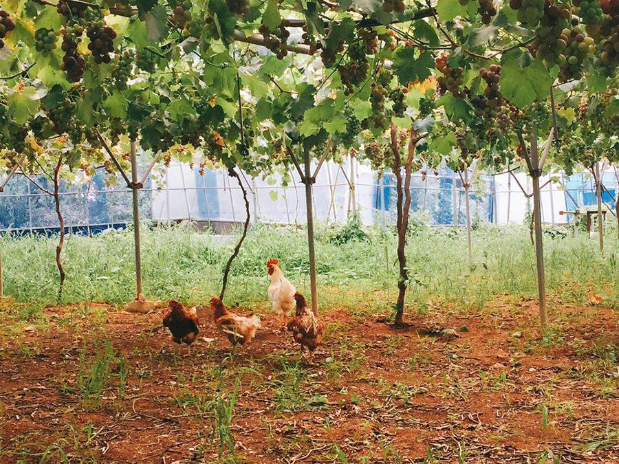 풀과 함께 자라는 포도 포도나무는 풀과 함께 자랍니다. 일부 하우스엔 멀칭을 했지만 기본적으로 제초제를 쓰지 않아서 풀들이 잘 자랍니다. 이 풀은 다시 땅으로 돌아가 양분이 되기도 하고 더운날 땅의 수분을 유지하게 해주는 역할도 해요. 예초기로 이 풀들을 잘라주는 일은 쉽지가 않지만 그래도 유기농 농사에 있어서 중요한 자원이기도 합니다.
