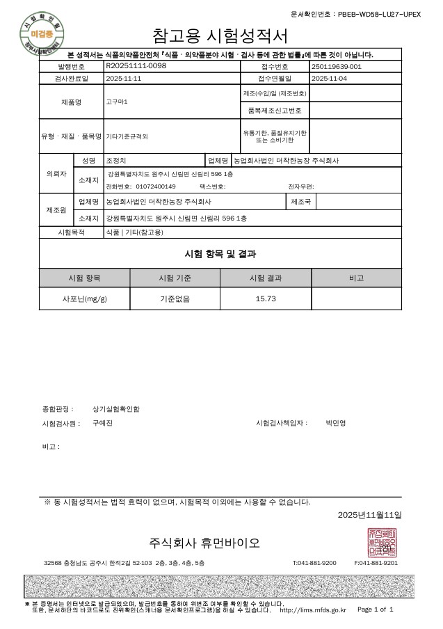 "2024년 시험 재배 확인, 2025년 실 재배 확인 완료!" 고구마에서 사포닌 성분이 검출된 것입니다. 우연이 아니었습니다. 2년 연속 확인된 이 결과는, 고구마가 단순한 구황작물을 넘어 '건강식'이 될 수 있다는 가능성을 보여주었습니다. 혹시 쓴맛이 날까봐 걱정하시는 분들이 계신데 사포닌 성분은 있지만 쓴맛 전혀 없이 달달한 고구마입니다. 농부의 지혜: 시작이 건강해야 결과도 건강하다 왜 굳이 비싼 '무병묘'를 고집할까요? 농사의 기본은 '씨앗'입니다. 고구마도 마찬가지입니다. 저는 농장에서 직접 키운 '건강한 무병묘'만을 사용합니다.