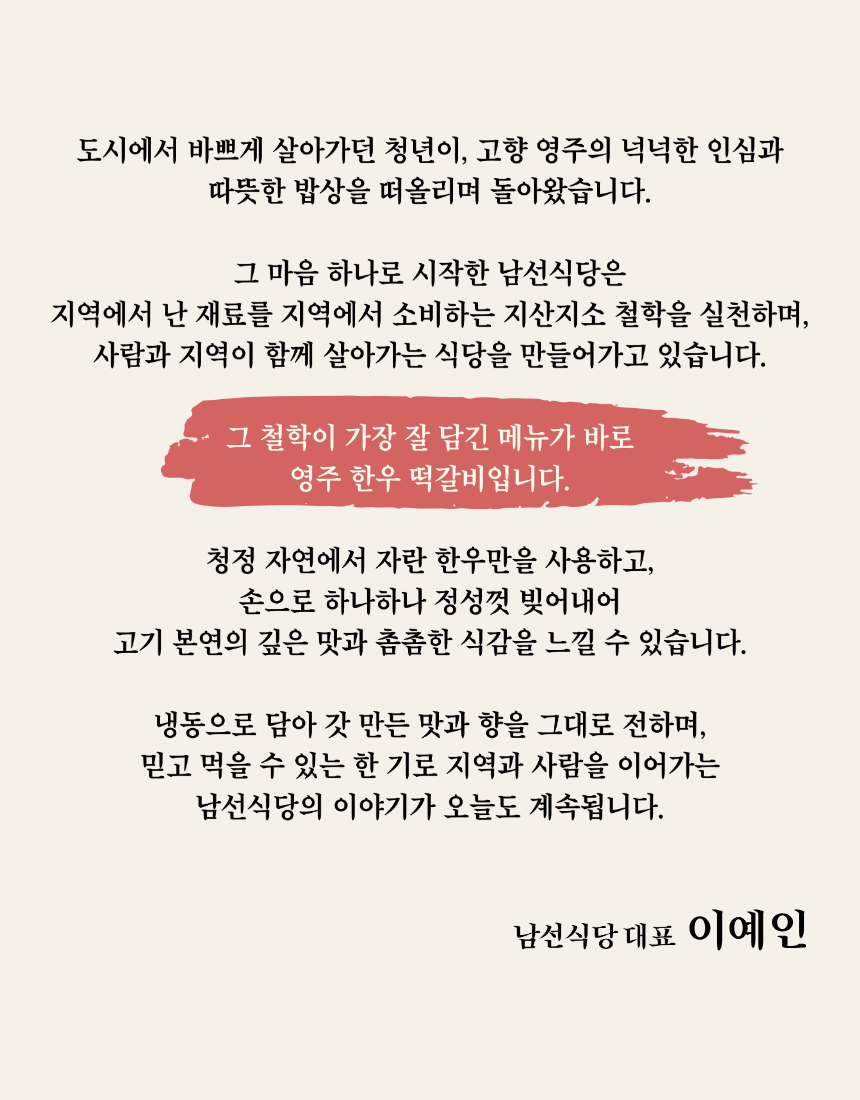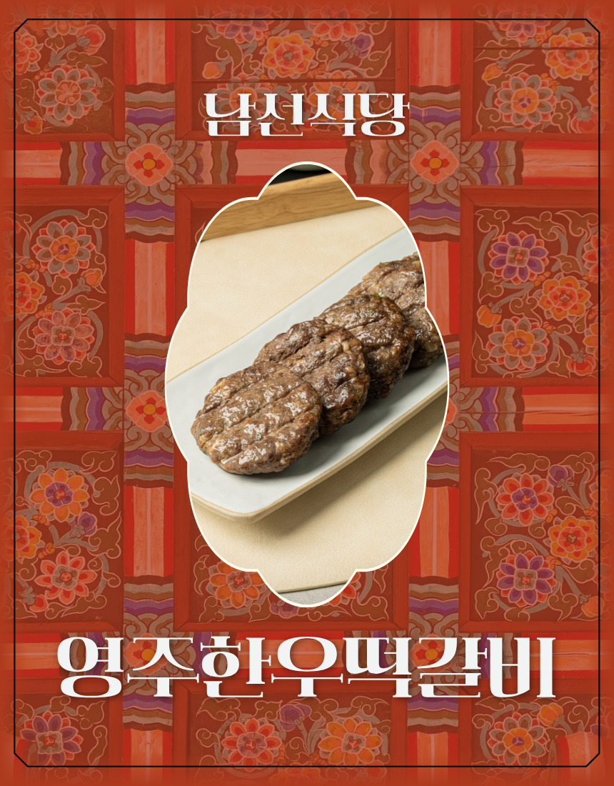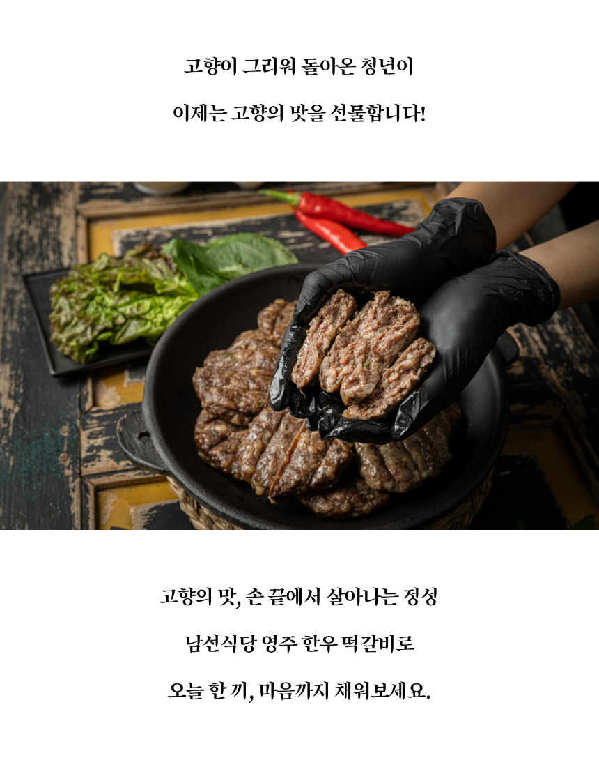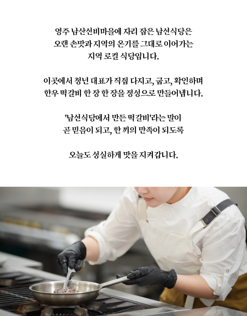 안내 | 📑 안내 마을기업 남산선비마을에서 출시한 영주 한우떡갈비 마을기업 남산선비마을은 마을 어르신들을 고용해 남선식당을 운영하고 있습니다. 이 식당의 시그니처 메뉴 중 하나인 한우떡갈비를 집에서도 간편하게 먹을 수 있게 밀키트로 만들었습니다. 좋은 재료를 아낌없이 담아 만든 두툼한 떡갈비입니다.