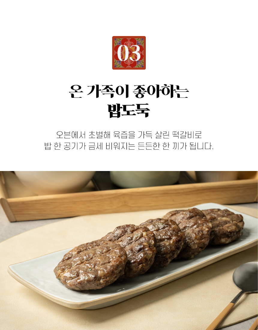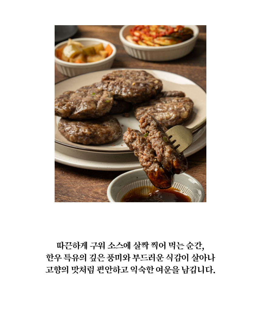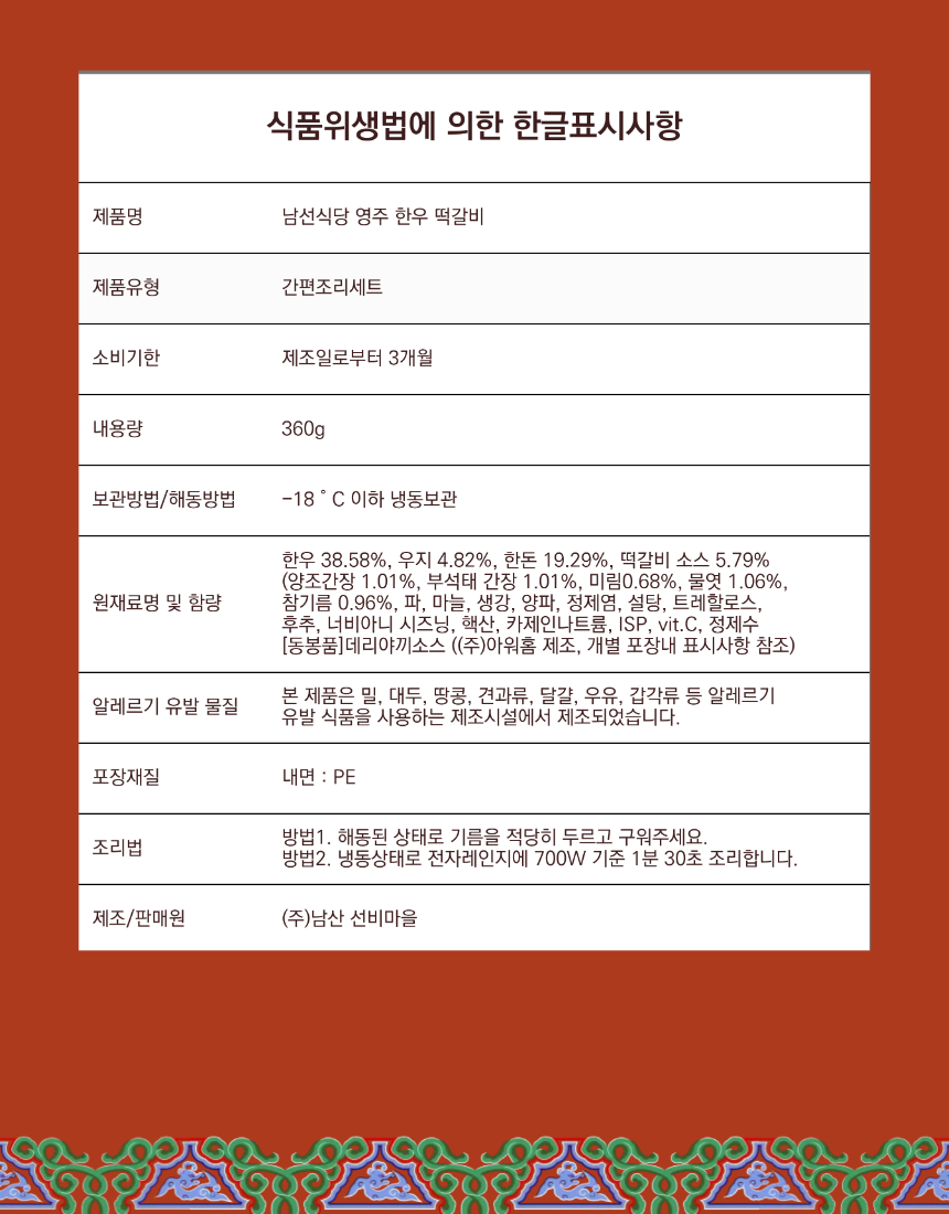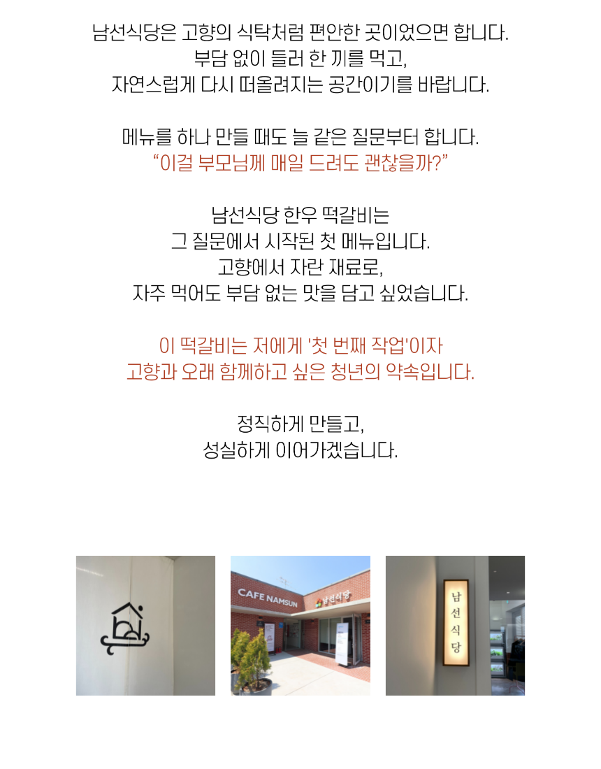 안내 | 📑 안내 마을기업 남산선비마을에서 출시한 영주 한우떡갈비 마을기업 남산선비마을은 마을 어르신들을 고용해 남선식당을 운영하고 있습니다. 이 식당의 시그니처 메뉴 중 하나인 한우떡갈비를 집에서도 간편하게 먹을 수 있게 밀키트로 만들었습니다. 좋은 재료를 아낌없이 담아 만든 두툼한 떡갈비입니다.
