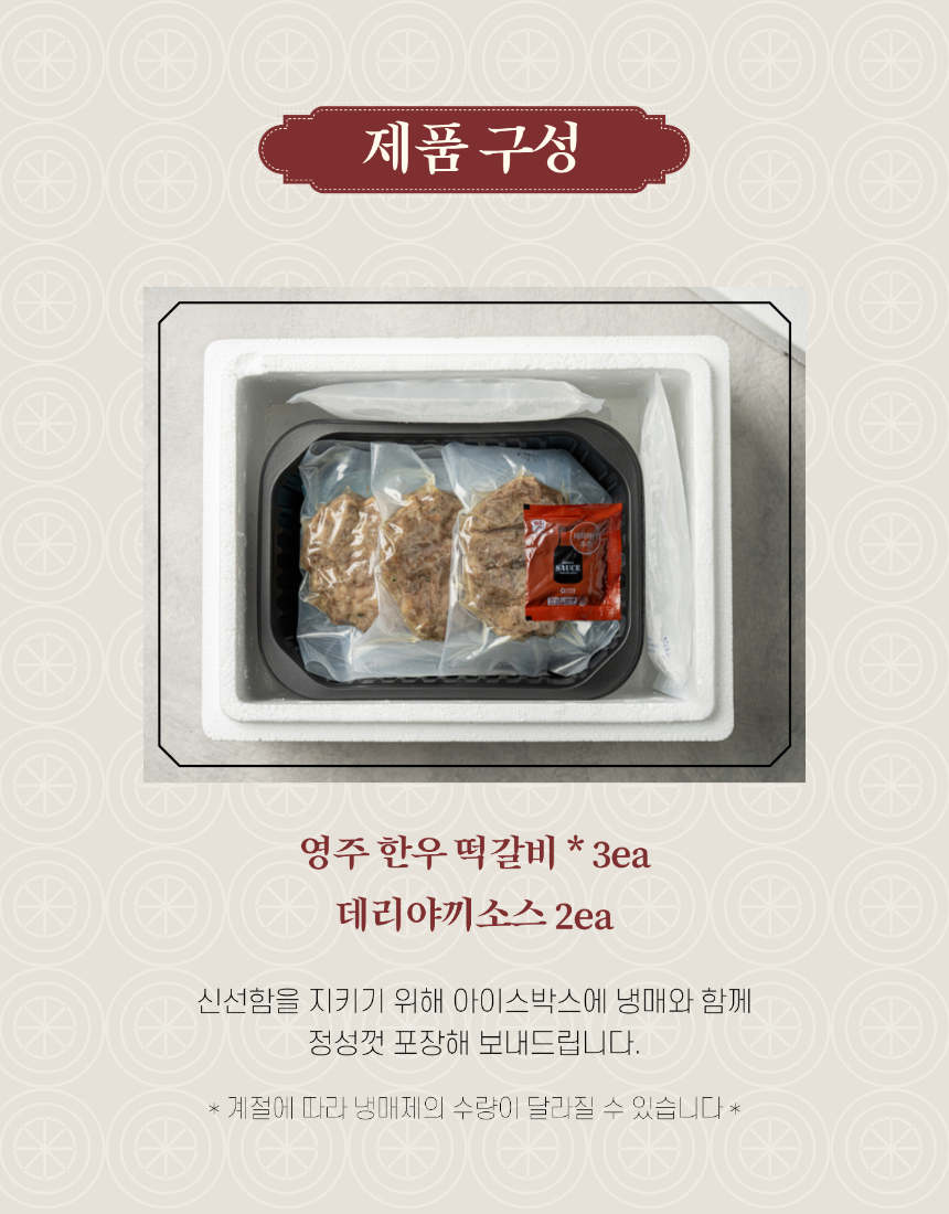 구성/포장 | 📑 구성 영주한우떡갈비 3개입 1세트 영주한우떡갈비 3개입 3세트 영주한우떡갈비 3개입 5세트 (무료배송)