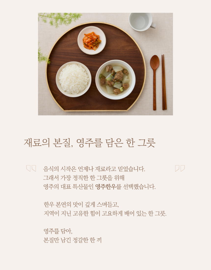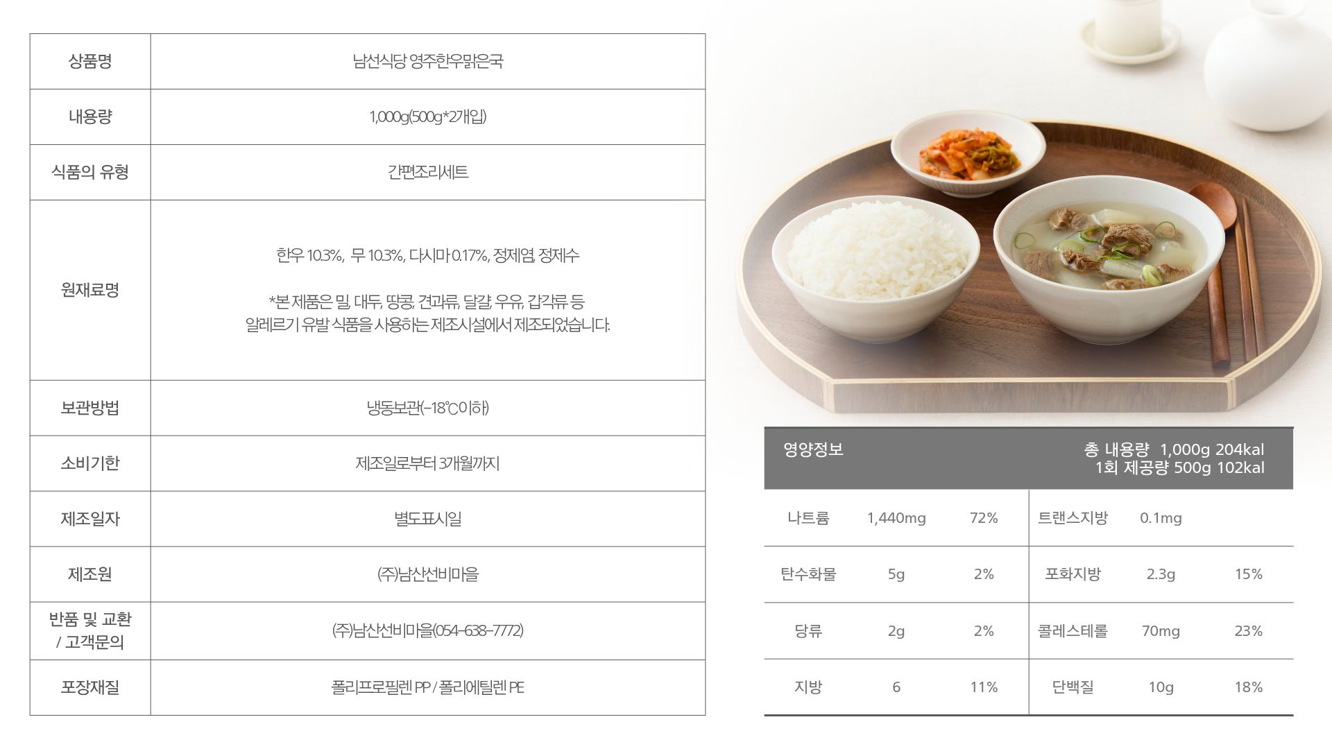 안내 | 📑 안내 마을기업 남산선비마을에서 출시한 영주 한우맑은국 마을기업 남산선비마을은 마을 어르신들을 고용해 남선식당을 운영하고 있습니다. 이 식당의 시그니처 메뉴 중 하나인 한우맑은국을 집에서도 간편하게 먹을 수 있게 밀키트로 만들었습니다. 한우가 듬뿍 들어간 속이 편해지는 국입니다.