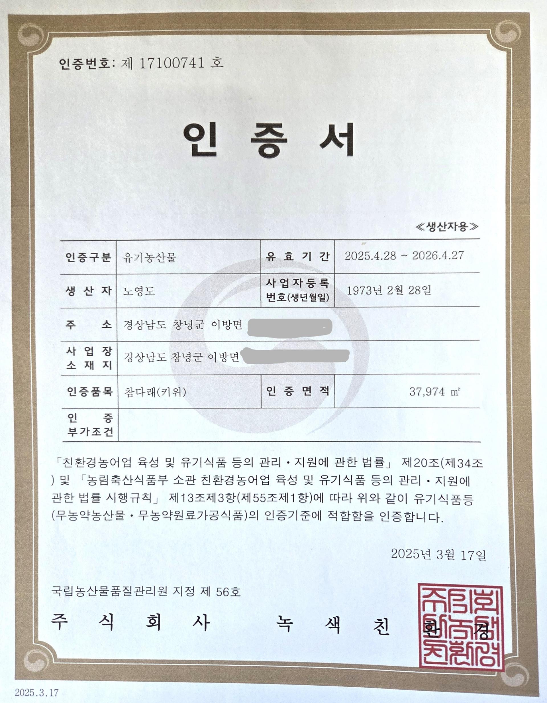 유기인증 키위 노영도 농부의 골드키위와 그린키위는 유기농인증을 받았습니다. 유기농 인증은 3년 이상 화학비료나 농약을 사용하지 않은 토양에서 재배하고, 병해충 방제는 천적, 유기농자재, 물리적 방법 등 자연적 방법으로 해야만 받을 수 있습니다. 무농약 인증 기간을 거쳐 유기인증을 받게 됩니다. 다만 포장박스는 이미 만들어 놓은 것에 무농약으로 표시되어 있어서 이점 참고 바랍니다. 유기인증번호 : 제 17100741 호