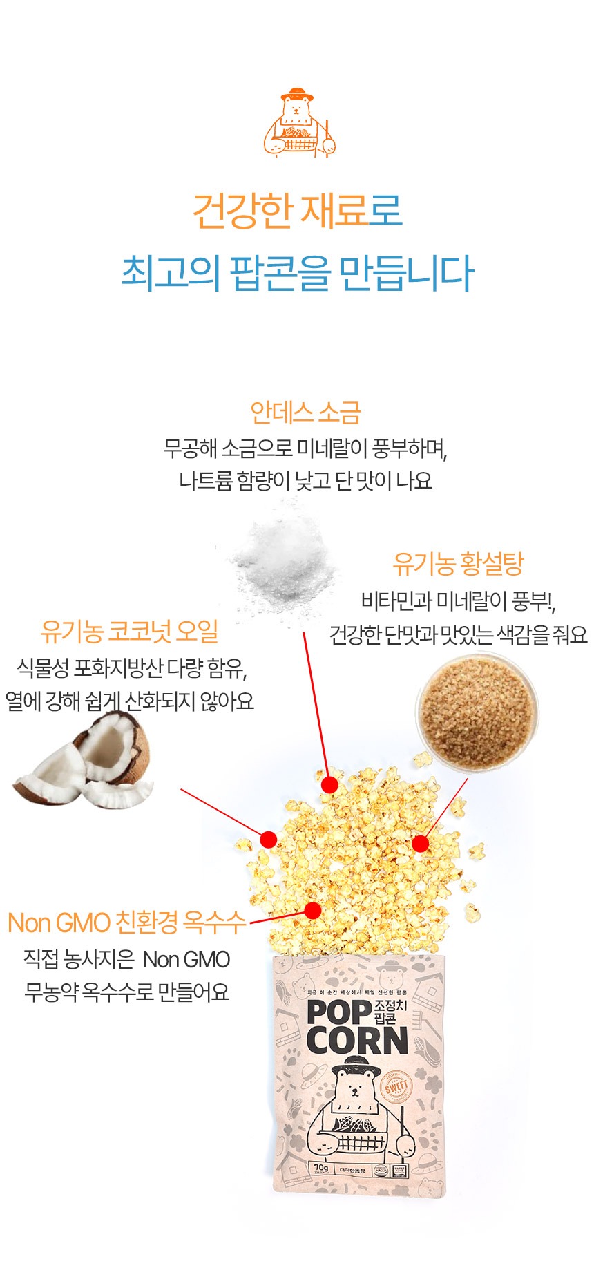 04. 조정치 농부의 친환경 무농약 옥수수로 만든 팝콘 직접 키운 non-GMO 옥수수로 만듭니다. 강원도 원주, 치악산 자락에서 농사를 짓습니다. 친환경 무농약으로 농사짓습니다. 팝콘에 잘 맞는 품종을 선택하여 심었습니다. 이에 끼거나 거슬림 없이 드실 수 있는 팝콘을 만듭니다. ※ 포장쓰레기 최소화를 위해 팝콘은 현장에서 예약하신 중량만큼 용기에 담아드립니다. 적당한 크기의 용기나 종이 봉투 등을 가져와주세요.