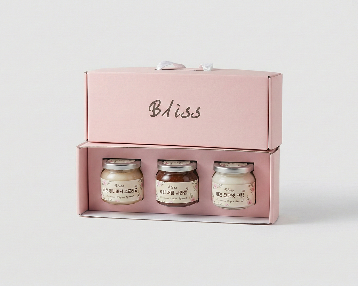 선물용 손잡이박스 선물용 손잡이박스를 선택하시면 스프레드 3종을 아래와 같은 박스에 담아 택배포장하여 보내드립니다.