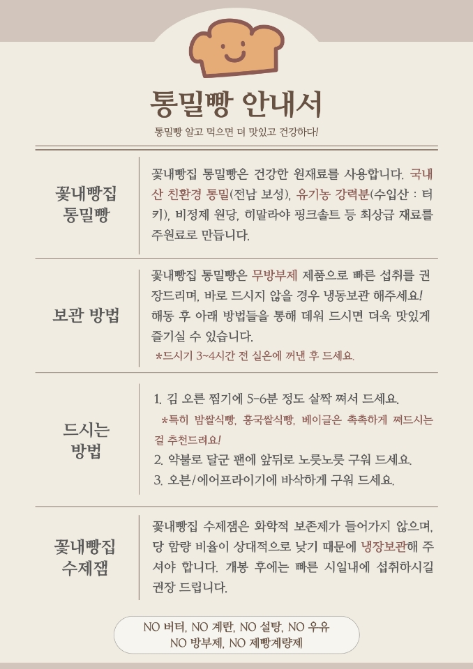 안내 | 📑 안내 봉화군 로컬 맛집 꽃내빵집 봉화군 로컬 생산자의 먹거리를 소개합니다. 꽃내빵집은 25년 7월 말에 오픈한 봉화읍의 따끈따끈한 신상 빵집입니다. 유기농 통밀과 쌀로 빵을 만듭니다. 봉화군 도시재생사업의 일환으로 상권활성화을 위한 순식물성 스프레드를 개발했습니다. 빵과 비스켓 어디에도 잘 어울려요.